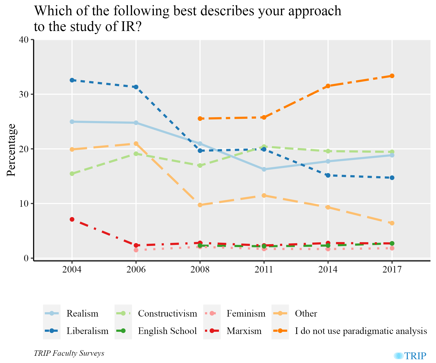 The 2017 TRIP Faculty Survey surveyed scholars of international relations in 36 countries and 14 languages to examine teaching and research trends and foreign policy views in the IR discipline. TRIP surveys all international relations scholars employed at a college or university who have an affiliation with a political science department or school of public policy and who teach or conduct research on issues that cross international borders. A full summary of the methodology can be found in "International Relations in the U.S. Academy" (ISQ, 2011).